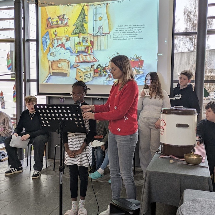 Die Klassensprecherinnen und Klassensprecher sowie die Vertrauenslehrkräfte hatten ein abwechslungsreiches Programm vorbereitet. Mit weihnachtlichen Liedern, einer gelesenen Weihnachtsgeschichte und einer kleinen Stärkung zum Essen wurde für eine festliche Atmosphäre gesorgt.